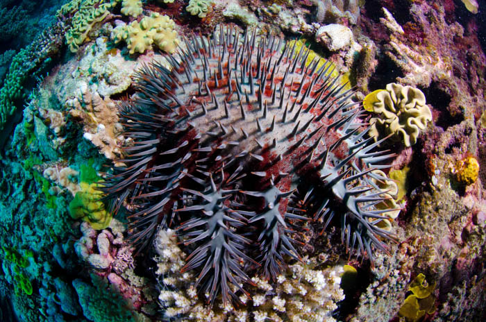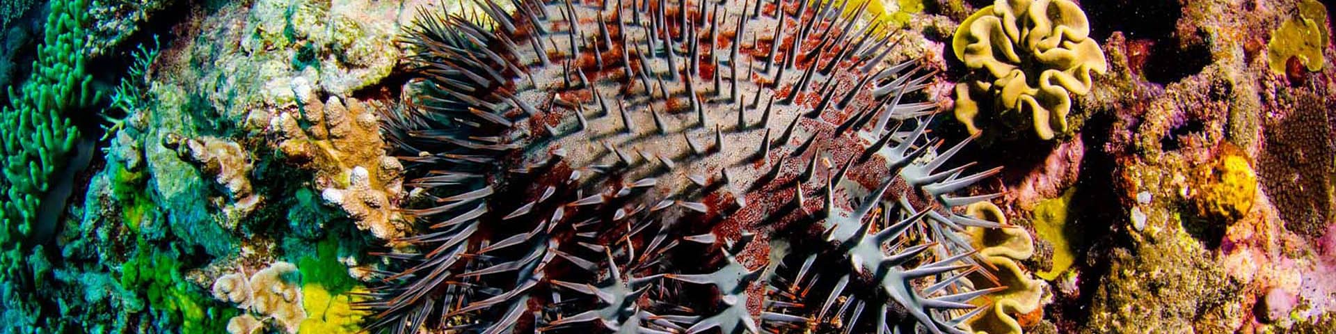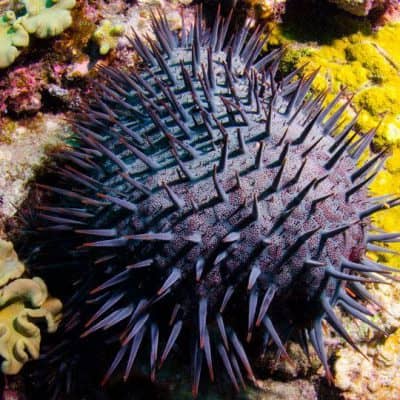 The Crown of Thorns (CoT) sea star is native to coral reefs in the Indo-pacific region. It is one of the largest sea stars in the ocean. It has up to 21 arms and reaching an average diameter of 35 centimetres but can grow up to 80 centimetres! The CoT is named for the venomous thorn-like spines covering its upper surface. It is the only known venomous sea star and possesses one of the highest fertility rates of any known marine invertebrate (animals lacking a backbone), releasing up to 65 million eggs over a single spawning season.
